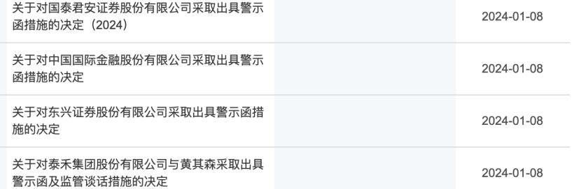 1月16日,证监会发布了关于对国泰君安、中金公司和东兴证券三家券商采取出具警示函措施的决定。证监会指出,中金公司、国泰君安作为泰禾集团股份有限公司(以下简称“发行人”)公司债券受托管理人,在受托管理期间未严格遵守执业行为准则,存在未对发行人未披露相关重大债务逾期及诉讼事项保持必要关注、未在年度受托管理事务报告中披露相关重大事项等情形。