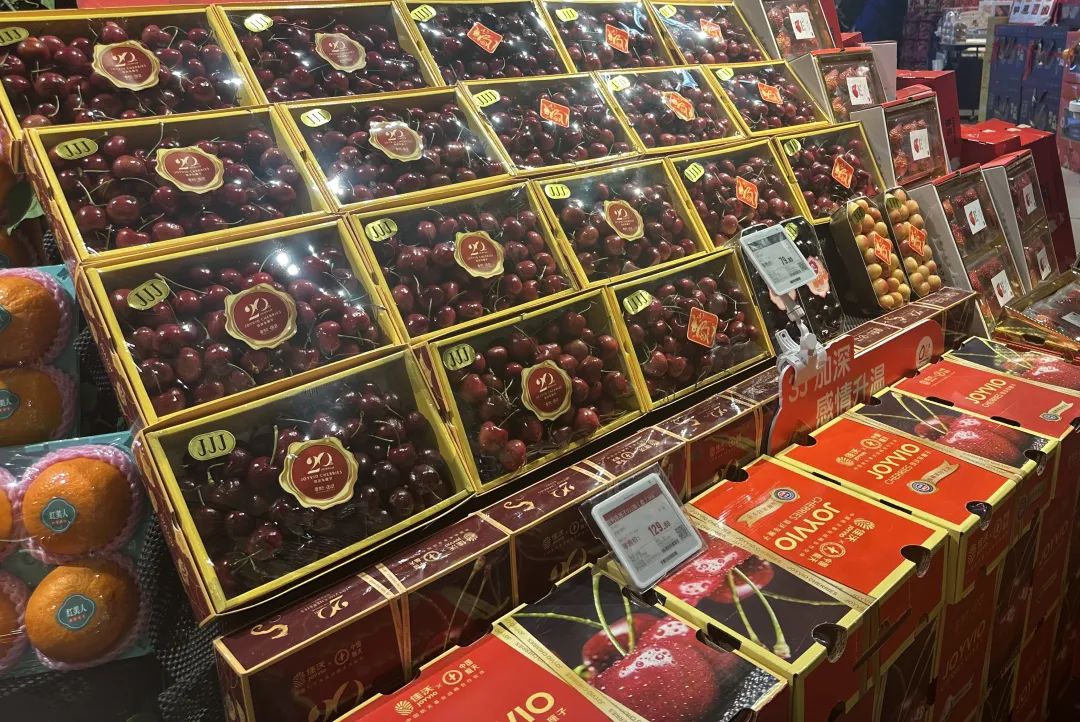 不光在批发渠道,在终端零售渠道也是如此。Ole超市是一家高端精品超市,1月17日「市界」在其国贸店发现,3J级的智利车厘子一盒两斤装售价129元,4J级的一斤卖79.8元。店员透露:“往年这个价格拿不下来。”