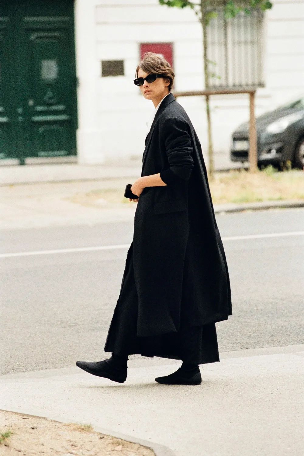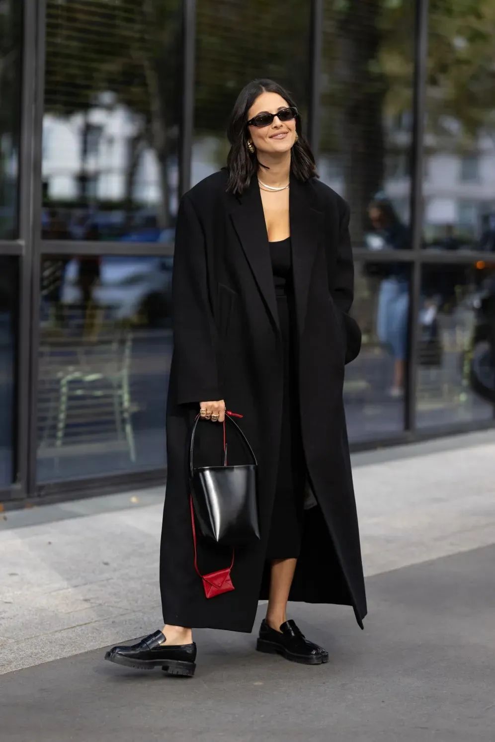 就算是平底鞋, 搭配直线型的裁剪和及脚踝的半裙,外加ALL BLACK的效果,同样率性又帅气!而且真的很藏肉哦~ 值得学习!