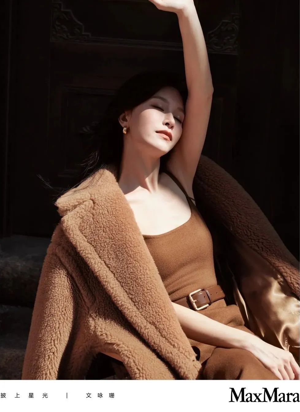 文咏珊这身是同色系穿搭,内搭选用高密度的针织连衣裙,外搭蓬松庞大的泰迪熊大衣,保暖的同时十分耐看,这里的腰带尤为重要,否则就乏味了。