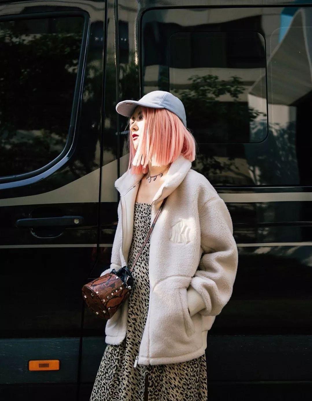 豹纹连衣裙衬托了短款的白色泰迪熊大衣,博主还搭配了棒球帽,瞬间一股韩风扑面而来,夹杂着运动活力的气息。
