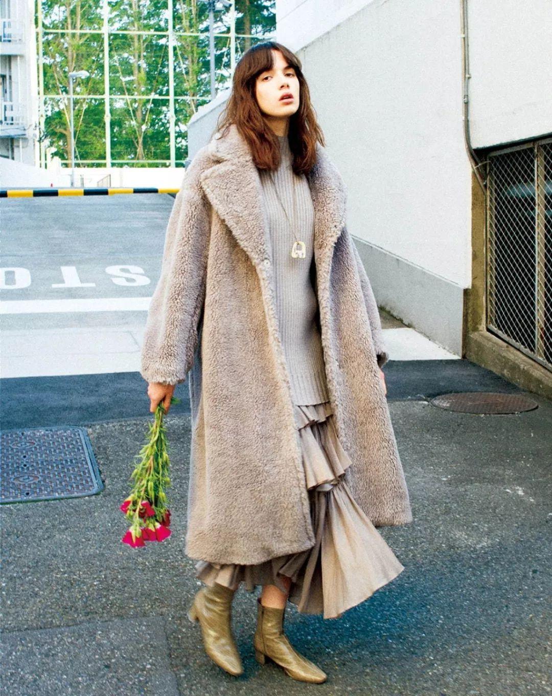 及小腿长度的羊羔毛大衣+半高领针织毛衣+荷叶边半裙+皮靴,温柔、优雅、文静的气质显而易见。