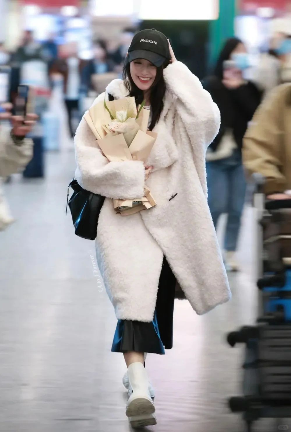 蒋依依这套 “ 羊羔毛大衣+皮裙+白皮靴+棒球帽 ”更适合日常出行穿着,像是一个人随性逛街、日常通勤、去超市等等。