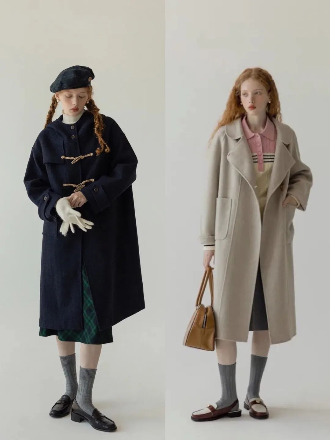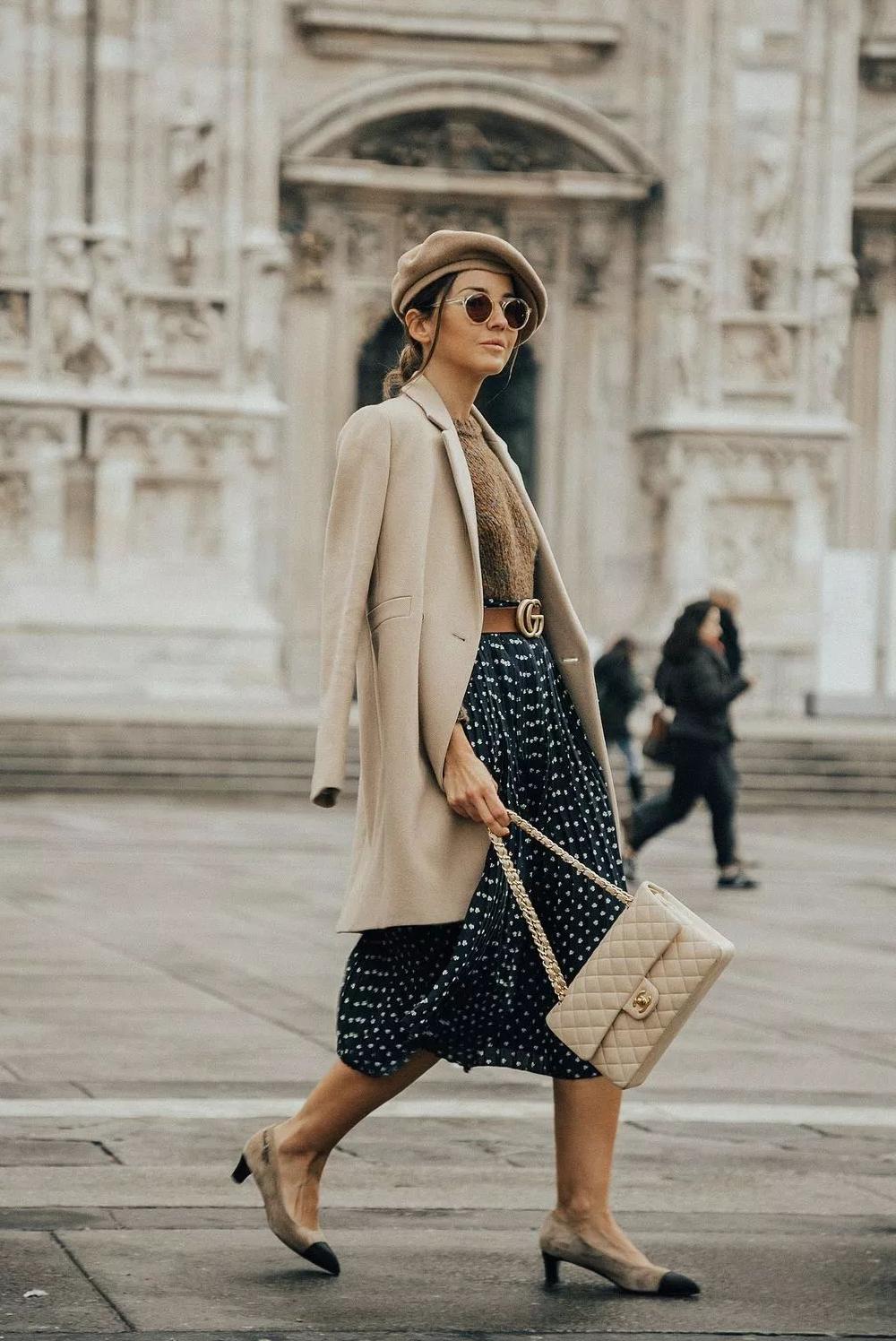 贝雷帽+毛衣+半裙+毛呢大衣,同样是一种法式穿搭中常见的,以下两套LOOK当中,都有一个共同点。