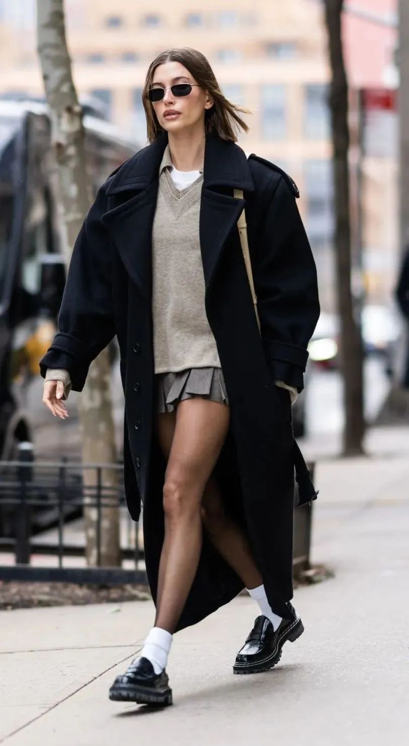 - 搭乐福鞋 -Hailey Bieber已经是这种穿法的 “ 资深用户 ” 了。她的街拍造型常常搭配迷你百褶裙、中筒白袜和乐福鞋,透着精致知性的学院风格。