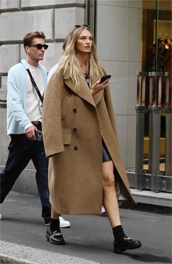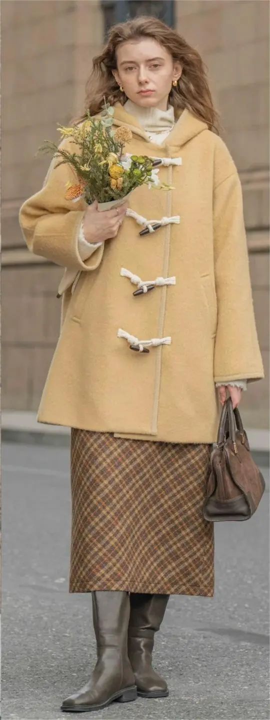 6. 法式少女大衣搭配半裙是法式风格穿搭中标志性的的搭配方式之一,大衣的长度通常位于膝盖附近,裙长大致小腿肚中部,搭上长筒袜与小皮鞋,文艺又减龄!