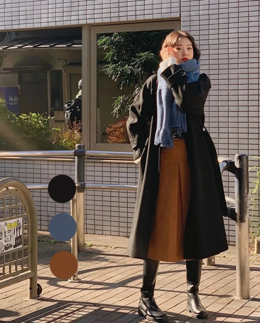 - 搭长筒靴 -围巾 + A型半裙 + 大衣 ,带来韩剧女主的感觉,博主kimehwa还通过复古色系的搭配使得整体穿搭更有意思!