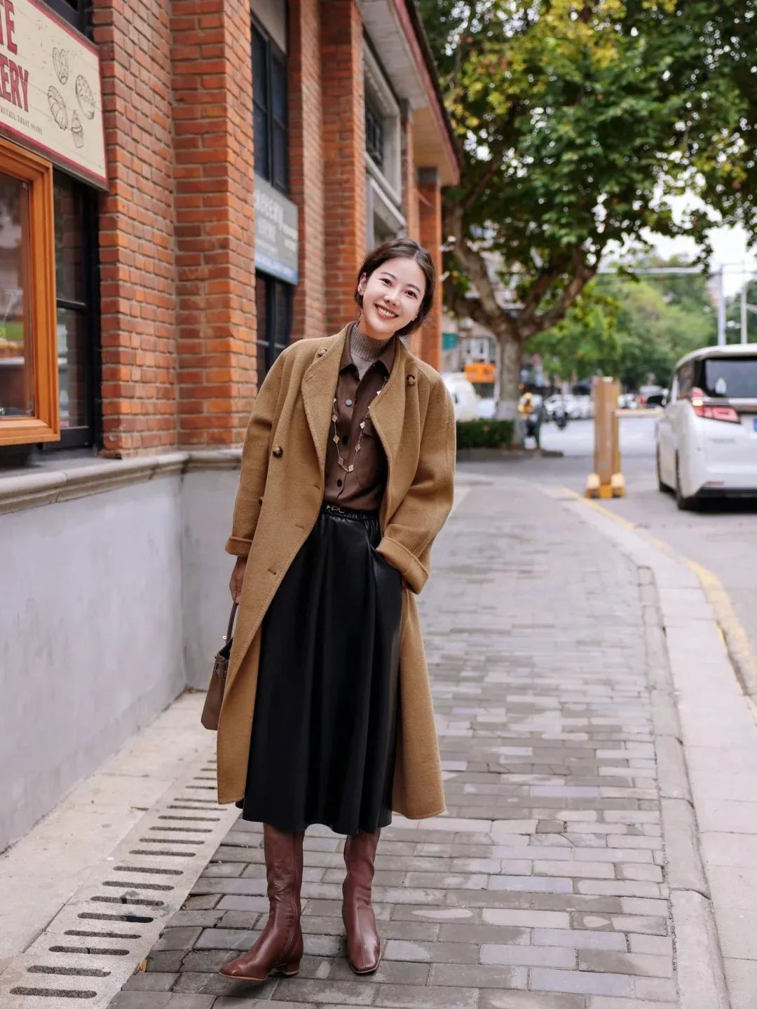 高领毛衣 + 衬衫 + 皮裙 + 驼色大衣,叠穿法则UP!!