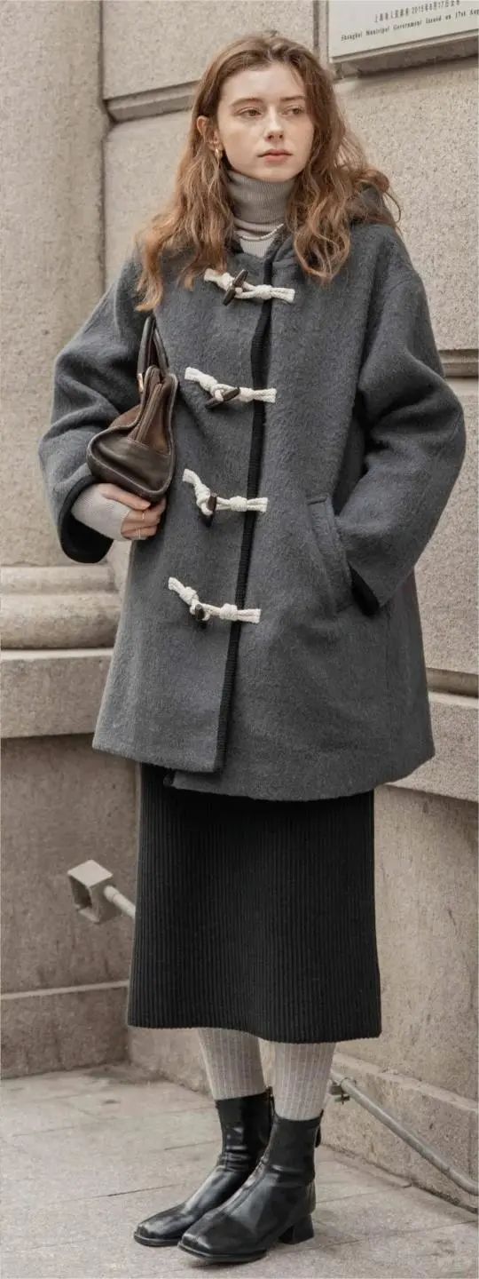 DAILYART 2023 FW高领毛衣 + 牛角扣毛呢大衣 + 直筒裙,由于牛角扣已经是一个比较吸睛又突出的元素,所以整体着装廓型从简,记得哦 ~ 搭配要有重点!!不要什么都想要!