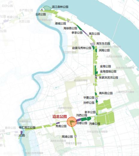 沿北公园是上海市外环生态公园带上浦东段的重要节点,该公园分类为生态涵养型公园,主题定位为森林游憩,功能特色为果林休闲,植物特色为早春冬景。