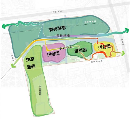 以森林为基底,利用外环带丰富林木、水系资源打造多彩林带,为前来休息放松的城市居民提供自然、休闲、宁静的慢行场所,如阳光草坪、亲水节点、乐果园、香草花园、生态展示区、生态保育区等。