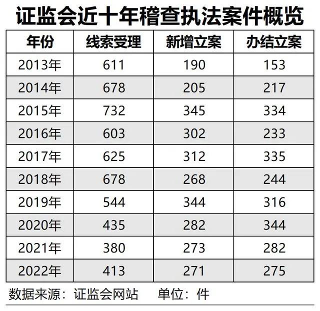 以证监会近十年稽查执法案例为例,线索受理的数量显著减少,而新增立案/线索受理的比例显著增加,体现证券市场违法行为的减少和执法力度的加大。