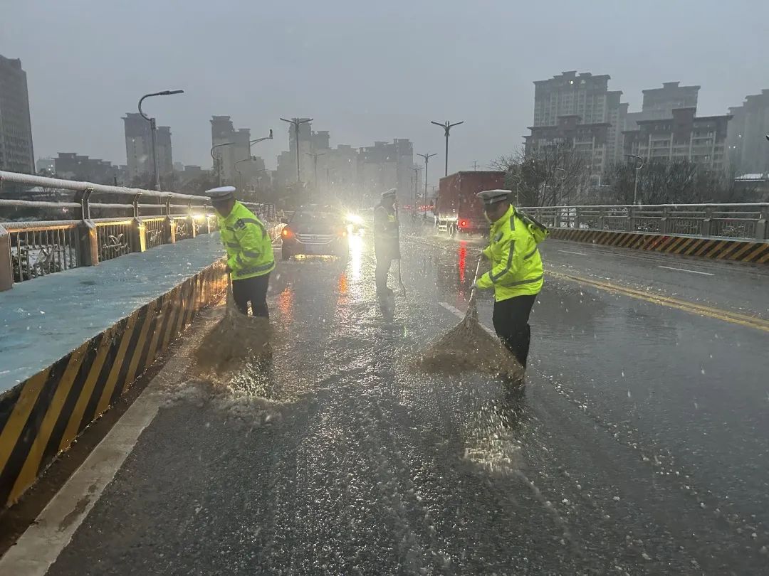 九江修水公安交警以雪为令、快速反应,加强重点路段的巡逻力度,全力引导车辆减速慢行、保持车距,最大限度地疏导交通,落实“降速、控距、亮尾”等措施,在辖区各易结冰路段,桥头路段撒盐铲雪,全力确保辖区道路安全畅通。