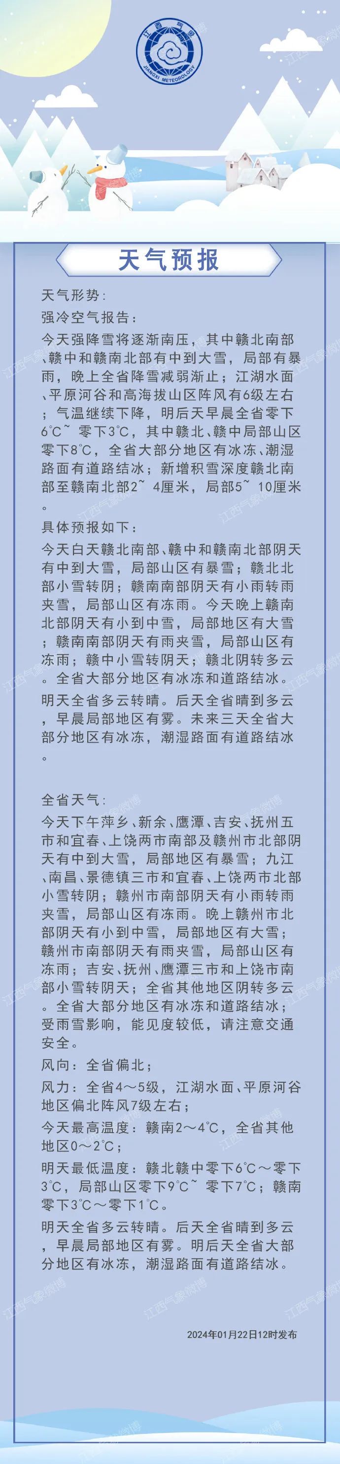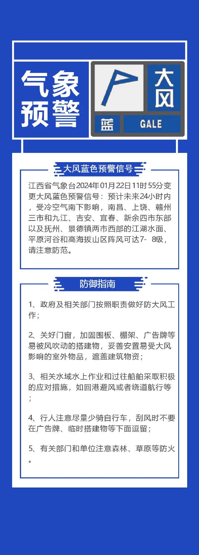 江西省气象台2024年01月22日11时55分变更大风蓝色预警信号: