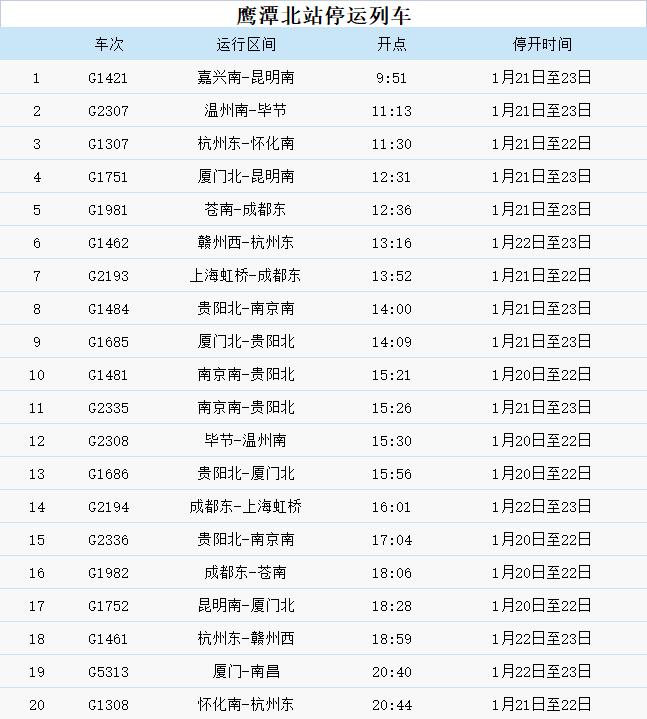 受雨雪冰冻天气影响,20日至23日,途经鹰潭北站的部分旅客列车停运。