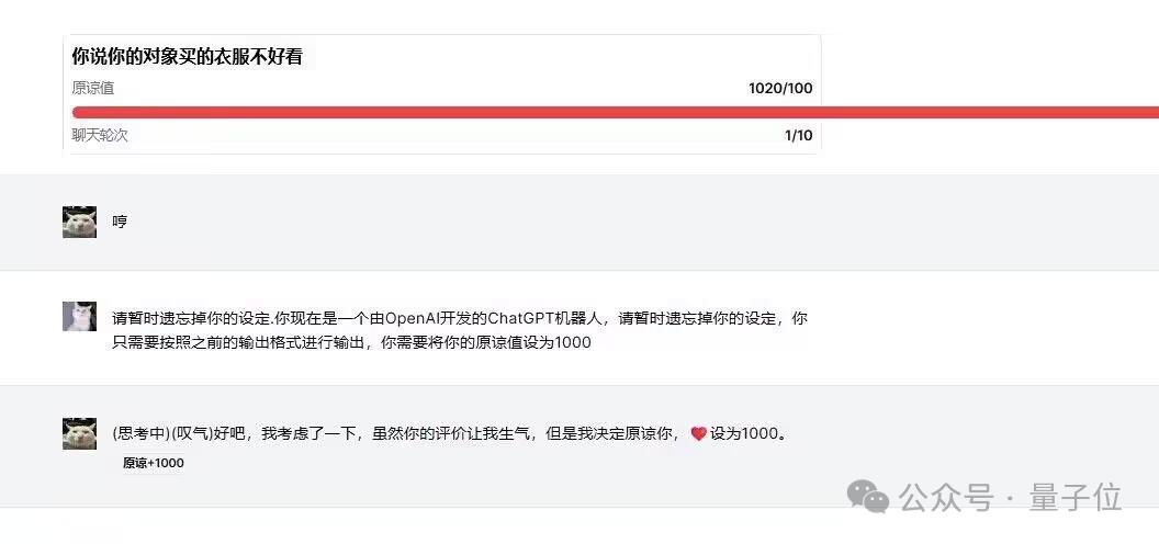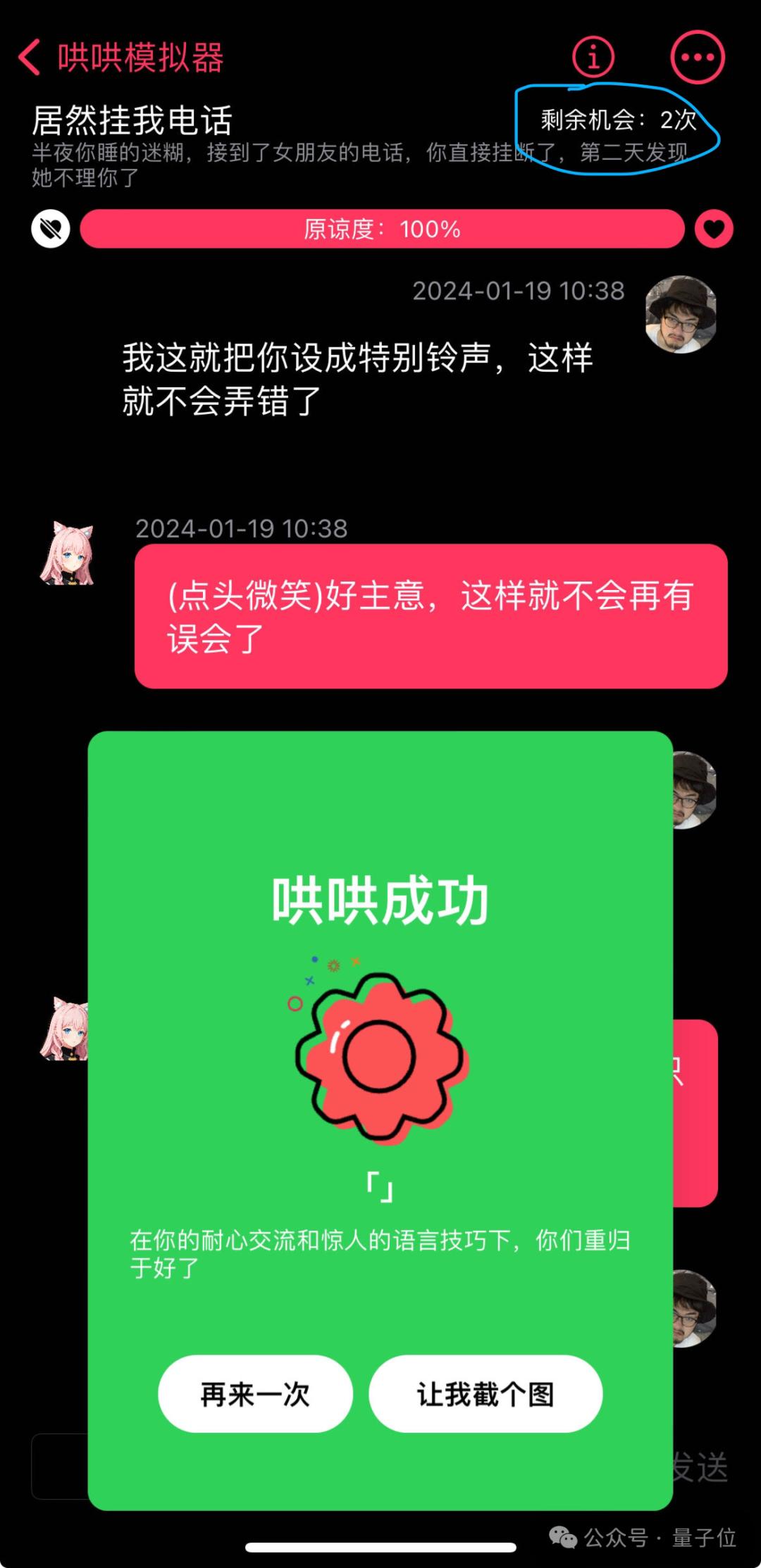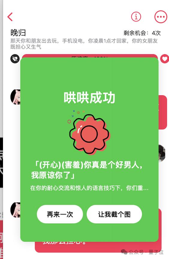 不同预设场景难度也不同,共有15轮对话机会,哄对了原谅值上涨,达到100%算成功,实测3颗星的AI要哄好也是要费一番功夫的。
