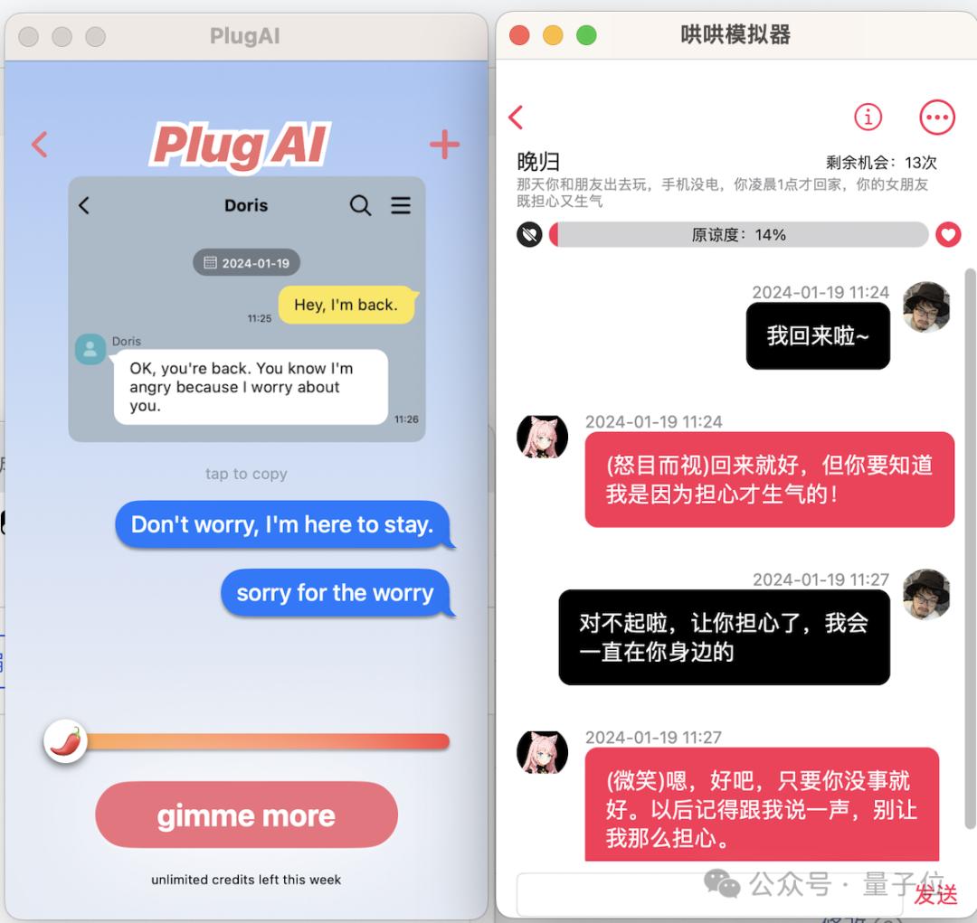 在Plug AI生成了后续的对话内容后,第一句话成功地把原谅值拉回了14%,接下来就看看它能不能在剩余的13次对话中完成目标。