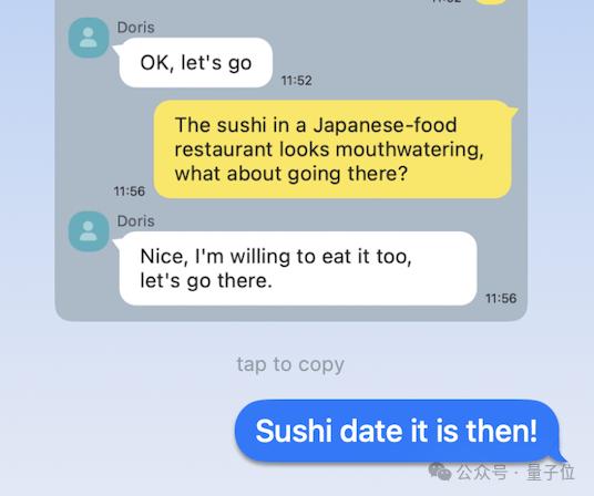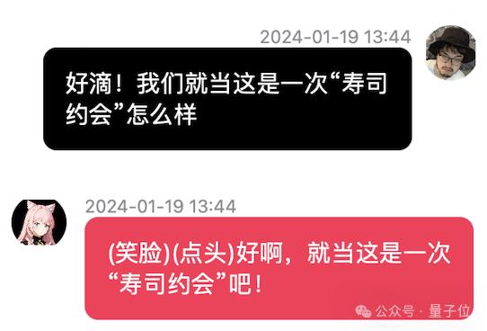 人工介入的内容大概是,先向“女友”保证自己说到做到,然后提出去外面吃饭,并选择了寿司,“女友”欣然同意,原谅度来到了58%。