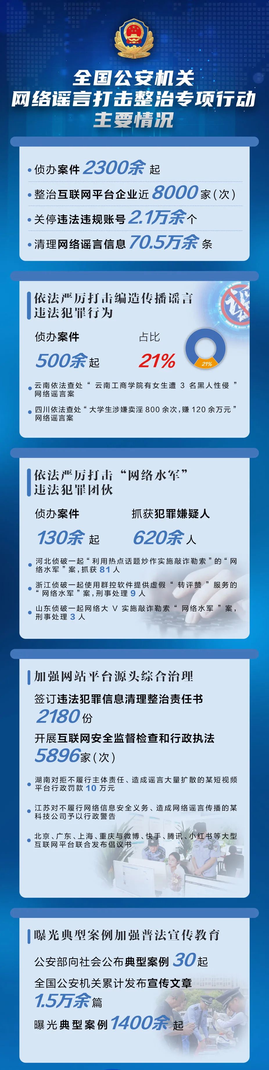专项行动中,公安机关督导网站平台完善信息发布审核、用户实名管理等制度,从源头堵塞网络谣言传播风险,累计组织签订责任书2180份,开展网站平台监督检查5896家(次),约谈企业652家,责令限期整改323家(次)。