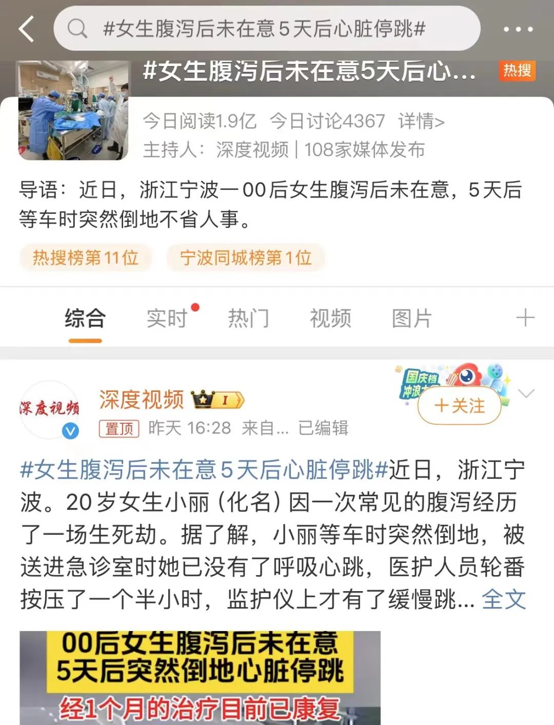 近日,一个新闻冲上热搜:一名00后女生腹泻后没太在意,结果5天后心脏停跳!