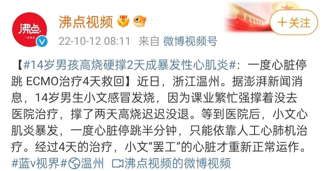 等到医院后,小文心肌炎暴发,一度心脏停跳半分钟,只能依靠ECMO(人工心肺机)治疗。经过4天的治疗,小文“罢工”的心脏才重新正常运作。