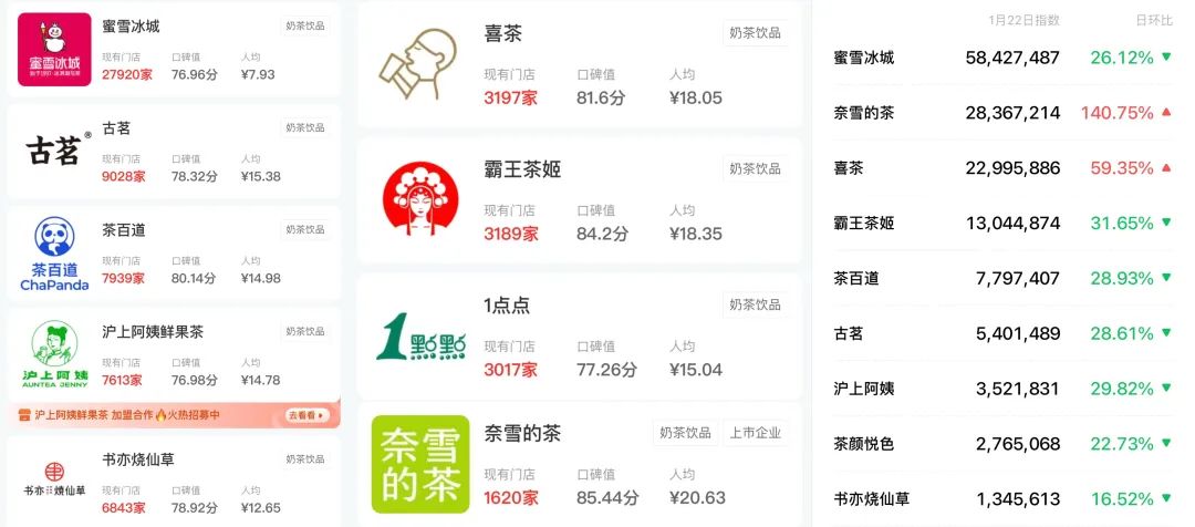 ▲(窄门餐眼和微信指数截图)虽然霸王茶姬的门店总数比蜜雪冰城、古茗、茶百道等要少一些,但它的知名度并不低,其微信指数仅次于蜜雪冰城、奈雪的茶和喜茶,位列行业第四。