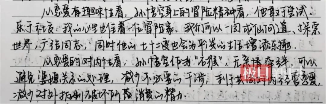 同学们的理由大体有:他武功高强、待人真诚、性格爽朗、幽默风趣、抗压能力强,颜值还高。还有人调侃“他是石头缝里蹦出,不用担心婆媳关系”“他是公务员,工作稳定,不至于让爱情‘一盘散沙’”“人脉广、朋友多、猴子猴孙多,便于创业”“不花心,不乱搞男女关系”。