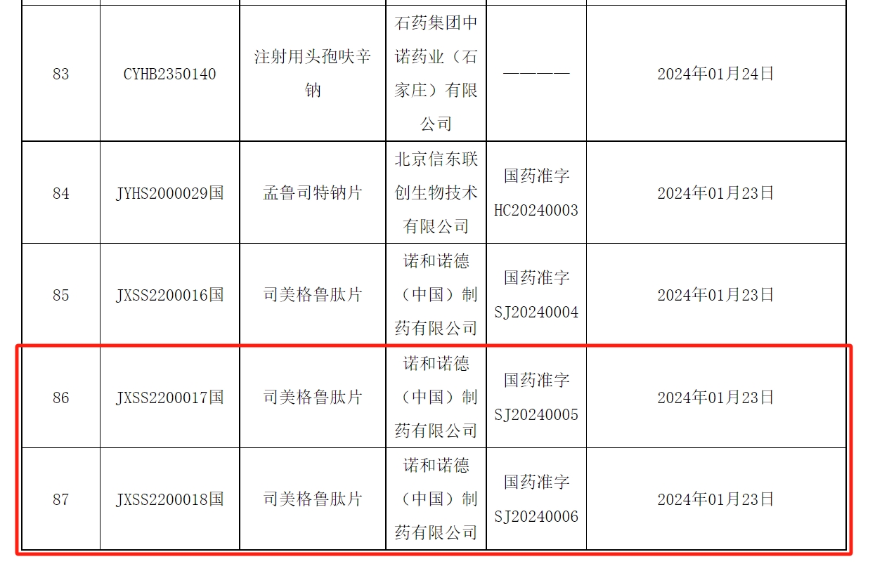 1月26日,国家药品监督管理局政务服务门户网站发布的2024年01月26日药品批准证明文件送达信息显示,诺和诺德的GLP-1受体激动剂司美格鲁肽片获批,批准日期为1月23日,共有两个批准文号。