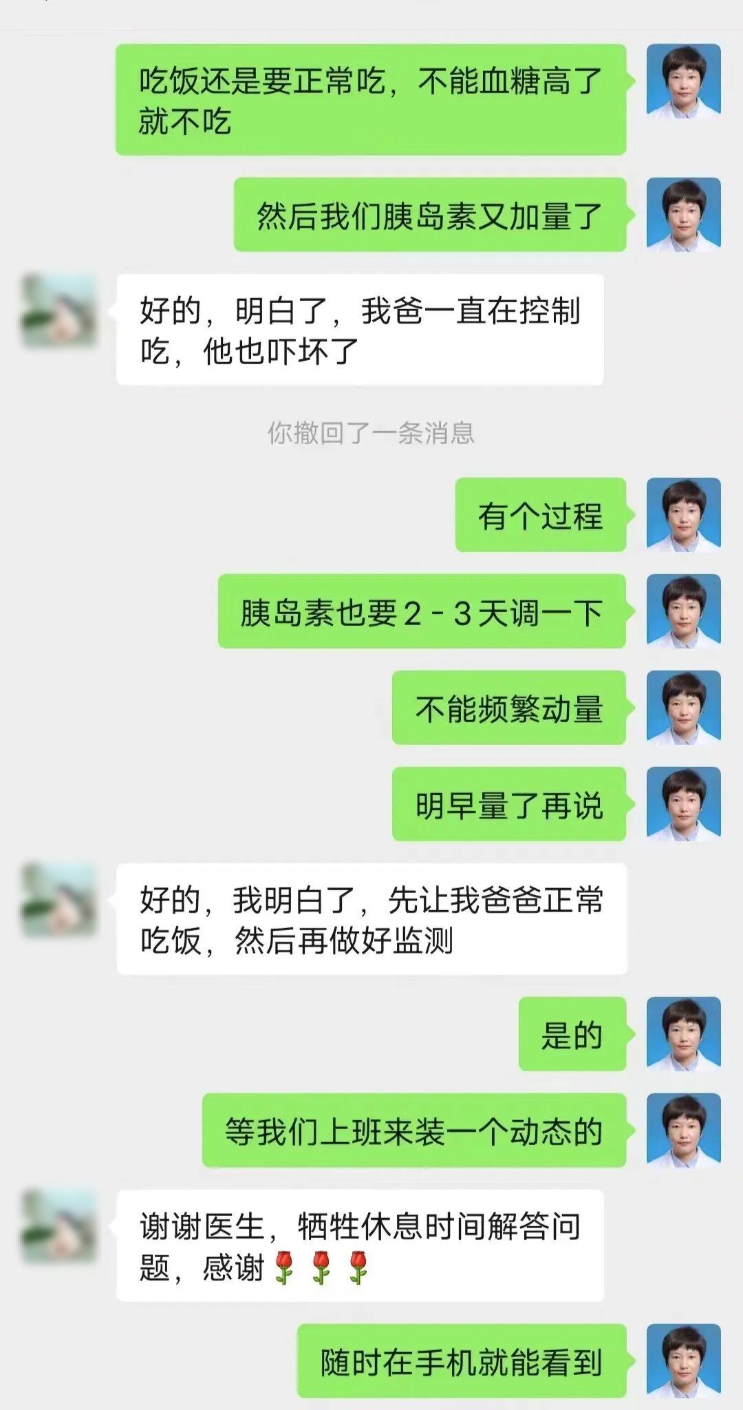 在治疗初期,袁先生时常会因血糖有波动而出现焦虑不安的情绪。中心家庭医生团队人员便常常通过微信、电话等形式给予患者及时耐心的解答和指导。通过跟踪随访患者血糖监测情况,家庭医生团队人员发现袁先生是因为进食主食较多而导致餐后血糖高,家庭医生张东方仔细调整了胰岛素的剂量,加用了针对性的口服药,并再三嘱咐减少精米精面,增加粗粮摄入。经过十来天的细致治疗,袁先生血糖逐渐平稳,控制达标。袁先生和家属没有了初诊糖尿病的焦虑,情绪也逐渐放松,对于张东方家庭医生团队的全程指导更是十分感激。
