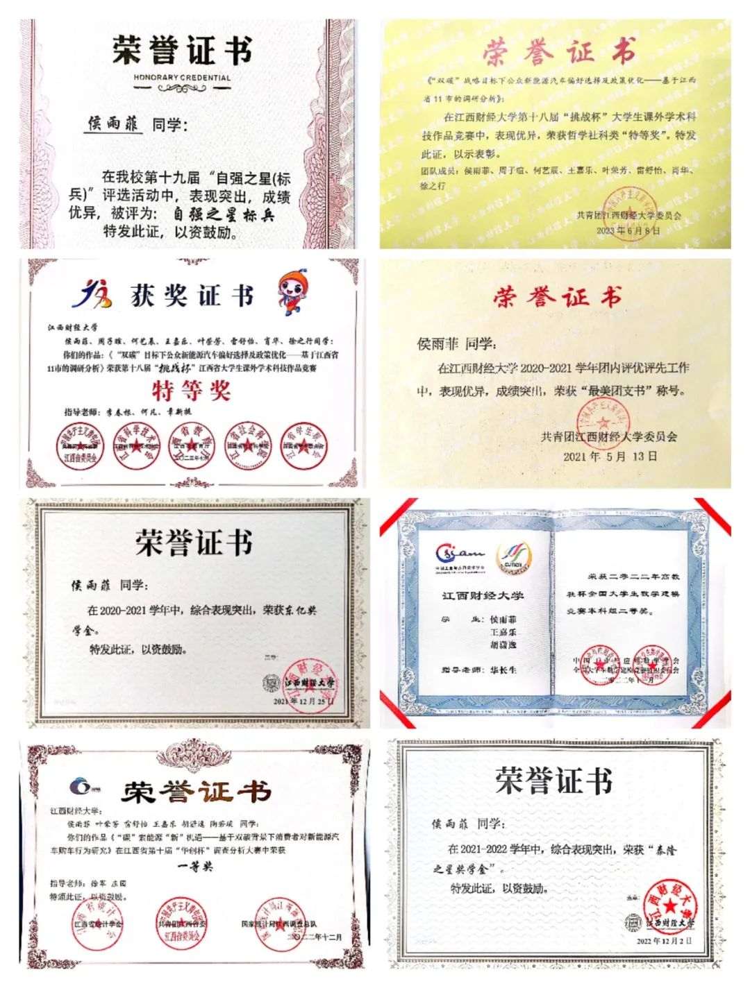 侯雨菲,女,中共党员,统计与数据科学学院应用统计2020级学生。加权成绩91.6,专业排名第二。先后担任班级团支书、学术部负责人、助理班主任;曾获“挑战杯”大学生课外学术科技作品竞赛国家级二等奖、江西省特等奖、全国大学生市场调查与分析大赛国家一等奖、全国大学生数学建模竞赛国家二等奖;两项国家级大创项目顺利结项;获国家奖学金、两项“江财之友”奖学金、三项一等奖学金、学业之星奖学金等共计9项奖学金;曾获自强之星标兵、最美团支书、市级优秀志愿者、优秀学生干部、先进组织个人等10余项荣誉称号,现已推免至中山大学。