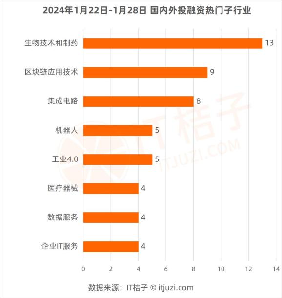 近一周最受投资人追捧的赛道分别是生物技术和制药、区块链应用技术、集成电路、机器人、工业 4.0、医疗器械、数据服务、企业 IT 服务。
