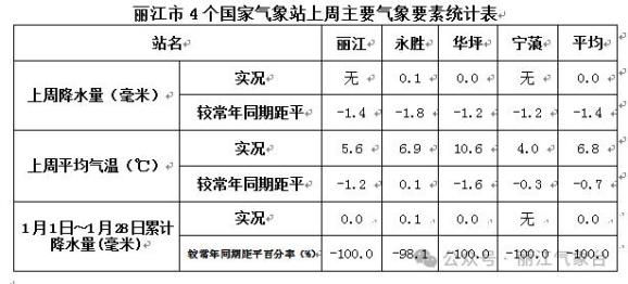 25~26日受南支波动气流影响,我市大部多云,西部、南部多云间阴有局地性阵雨,高海拔地区有中到大雪。其余大部时段我市以晴或晴间多云天气为主,中高海拔地区早晨有霜或霜冻,昼夜温差大。上周4个国家气象站中永胜站出现0.1毫米降水,其余三站无有量降水,较常年同期偏少1.4毫米;平均气温6.8℃,较常年同期偏低0.7℃;平均累计日照47.8小时,较常年同期偏少8.2小时(详见下表)。