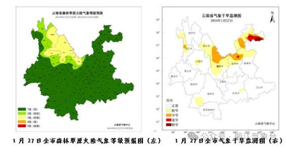 上周(1月20日20时~1月27日20时)全市有31个气象站监测到降水,平均降水量为0.2毫米,最大降水量4.3毫米,出现在玉龙县大具乡牦牛坪站;全市最高气温25.0℃,出现在华坪县石龙坝镇石龙坝站;最低气温-9.9℃,出现在古城区束河街道九子海站。据云南省气候中心1月27日监测我市除玉龙县西部森林草原火险气象等级为2级(较低)外,其余地区为3级(较高)(见下页图左);据云南省气候中心1月27日监测(见下页图右),古城区、永胜县大部出现轻度气象干旱,华坪县大部出现中旱。