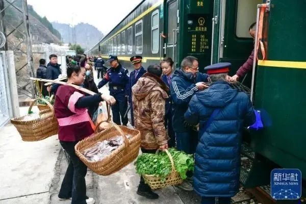 随着春节的脚步临近,行驶在贵州群山之间的5640/5639次慢火车,也悄悄地多了一些新变化。这趟怀旧的绿皮火车,装饰得格外漂亮,车窗上贴满了各种式样的龙年剪纸窗花、车厢内挂满了红灯笼和春联。彩色的福袋和各色山货连成串,年味满满。下午三点半左右,随着数声鸣笛,5640/5639次公益性慢火车到达贵州省黔东南州凯里市的六个鸡火车站。早在站点旁等候的数十位村民,挑起蔬菜瓜果、鲜鱼、鸡鸭,还有种类繁多的山货特产,在列车员的帮助下上了车。铁路贵阳至玉屏区间。对沿途10多个小站附近的村民而言,这趟开到村口的慢车就是他们的“致富快车”。沿线村民搭乘慢火车,出门走亲访友,把深山里的鸡鸭牛羊、瓜果蔬菜、土特产品搬上火车,再运到县城售卖。在这个热闹的“新春山货集市”中,新鲜的蔬菜味、满满的生活味、浓浓的人情味正交织升腾。