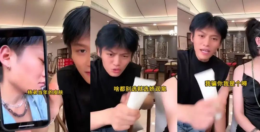 在一段直播切片中,小杨哥先是以身试法声称娇润泉治好了小杨弟的粉刺,随后又以一如既往的夸张风格为娇润泉的质量担保——“我骗你我是个嘚”。