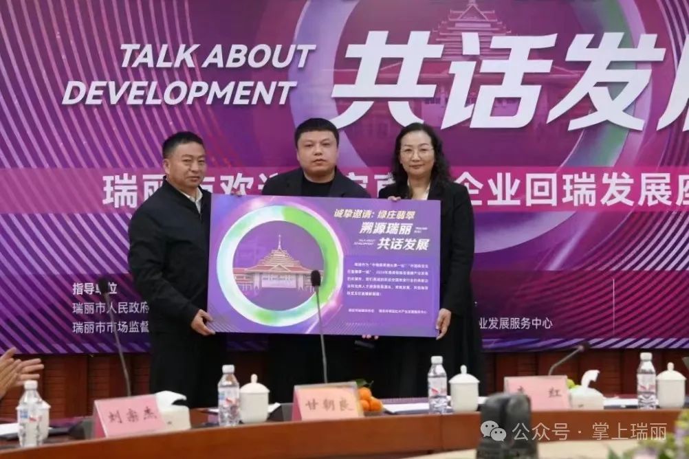 座谈会上,德宏州和瑞丽市相关领导向企业代表“绿庄翡翠”发出邀请,欢迎全国珠宝行业的商家企业和优秀人才回到瑞丽发展。