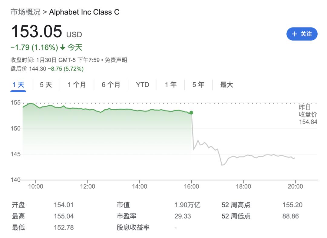 谷歌盘后交易跌超5.7%,市值蒸发1088亿美元(约合7731亿元人民币),根据报道,这与其AI发展和广告收入不及预期等因素有关。