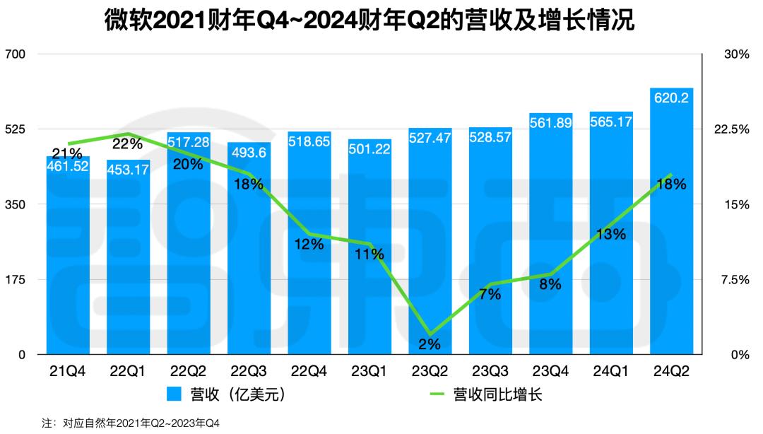 在微软2024财年Q2(对应自然年2023年Q4),微软营收达620.20亿美元,同比增长18%。如下图所示,2023年以来微软营收稳步爬升,在经历了疫情后的数字化寒冬后,恢复了高速增长。