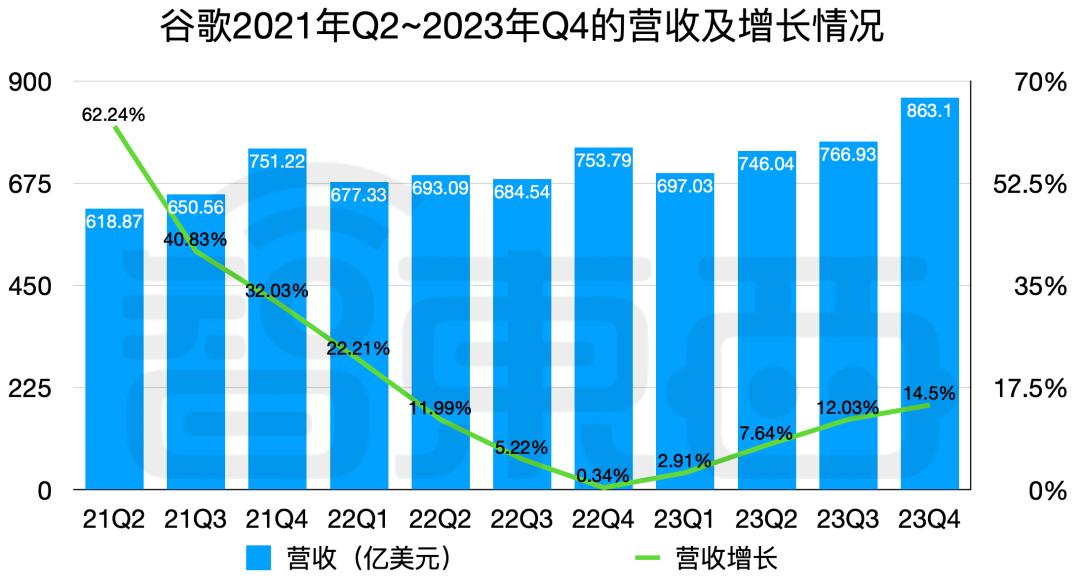 再看看谷歌这边,第四季度总营收达到863.10亿美元,同比增长14.50%。这一增速与前两年疫情期间的两位数增长有较大差距,但已逆转了上半年的颓势,出现回暖。