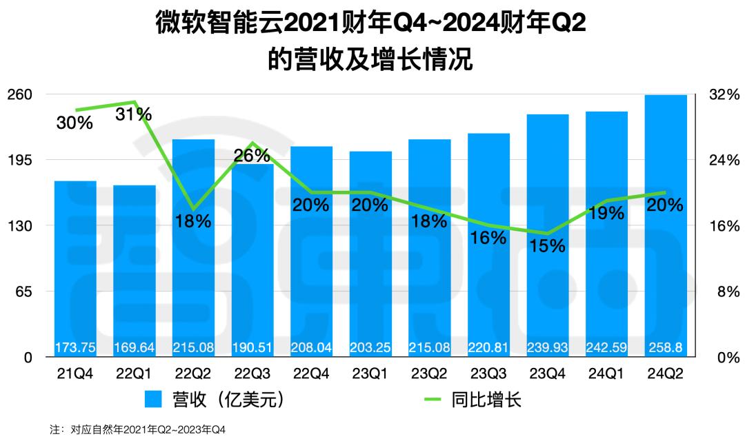 在微软2024财年Q2(对应自然年2023年Q4),微软智能云营收为258.80亿美元,同比增长20%。