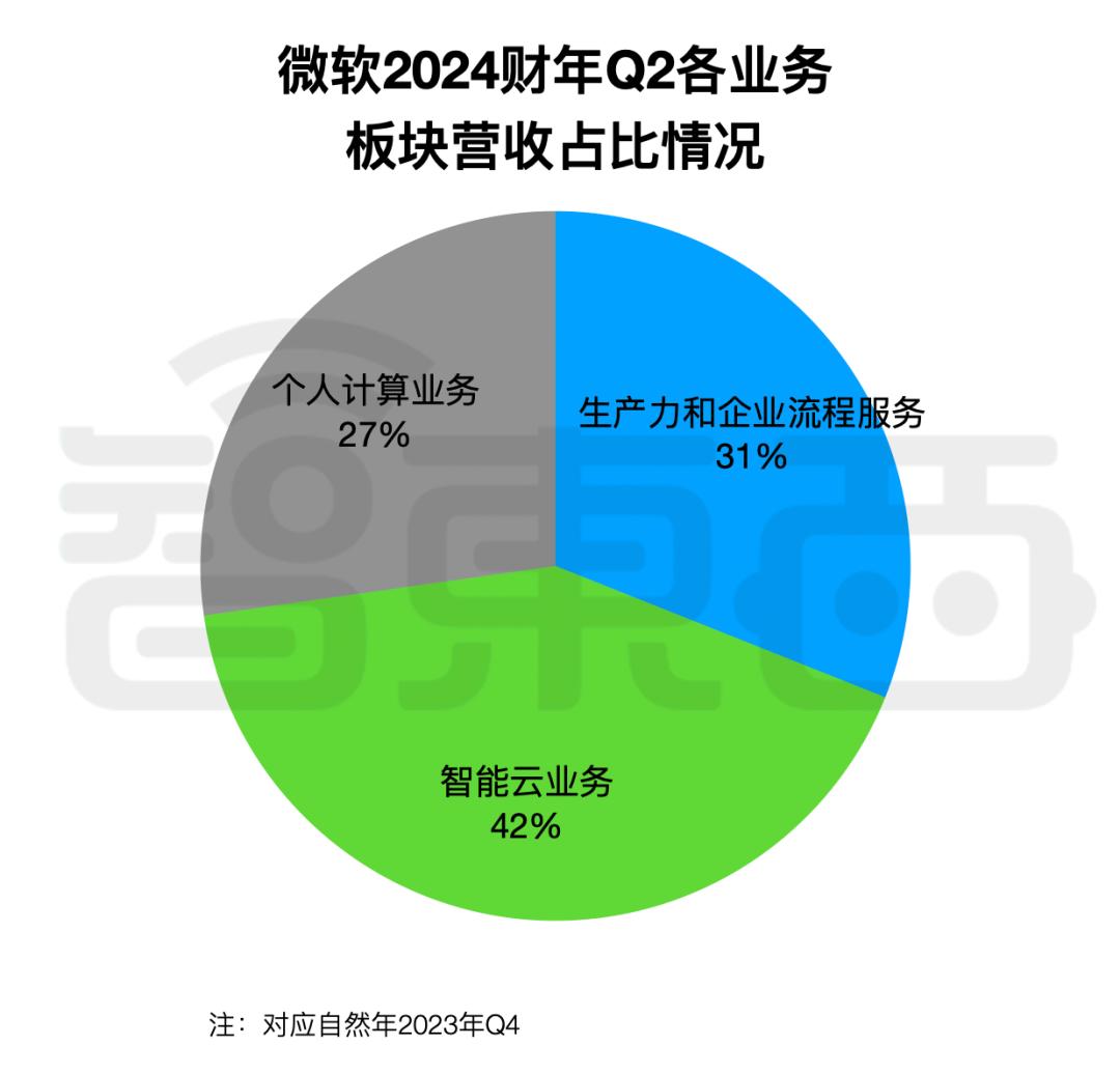 ▲微软智能云2021财年Q4~2024财年Q2的营收及增长情况微软主要有三大业务板块,个人计算业务、生产力和企业流程业务、智能云业务。从整体业务板块来看,微软智能云业务占总体营收达到42%,是微软的最大营收板块。