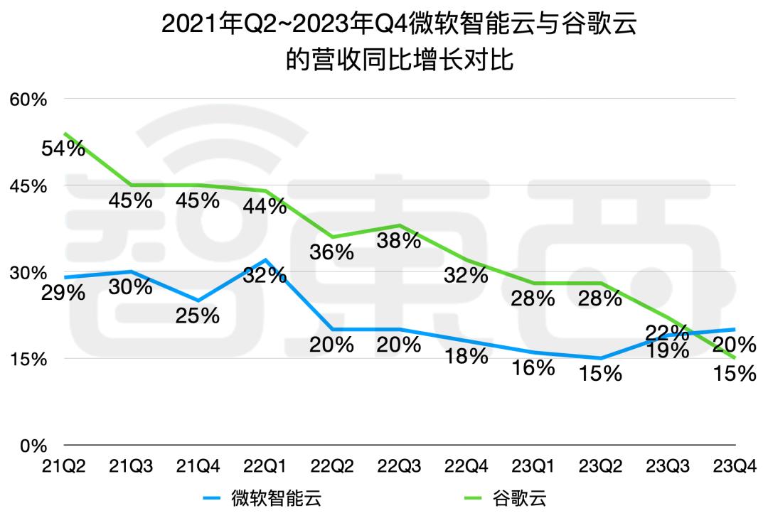可以看到,对比微软智能云近三年的增长幅度,谷歌云营收增速放缓,首次低于微软。但微软智能云的体量是谷歌云的近3倍,在这波AI浪潮下,微软云率先吃到了AI红利。