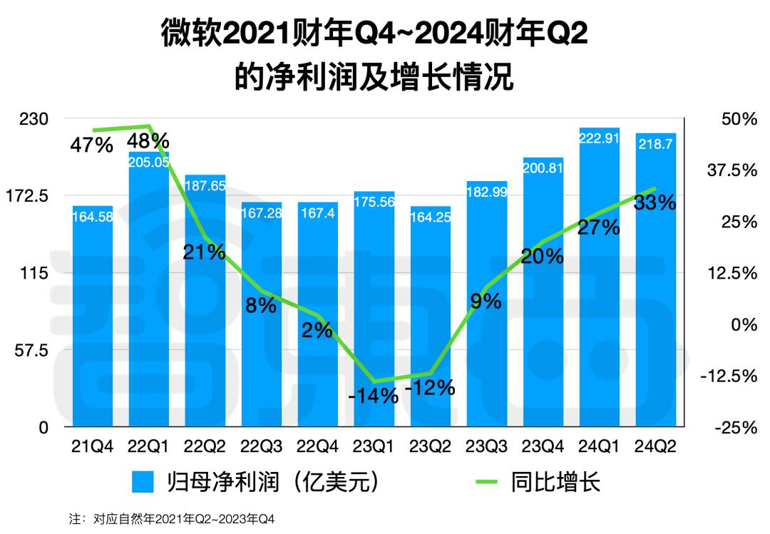 微软的盈利能力没让市场失望。在微软的2024财年Q2(对应自然年2023年Q4),微软净利润达到218.70亿美元,这是近十个季度以来连续第三季度突破200亿美元,相当于日赚17亿元人民币;同比增长33%,不再出现2022年类似的负增长,且增速正在加快。
