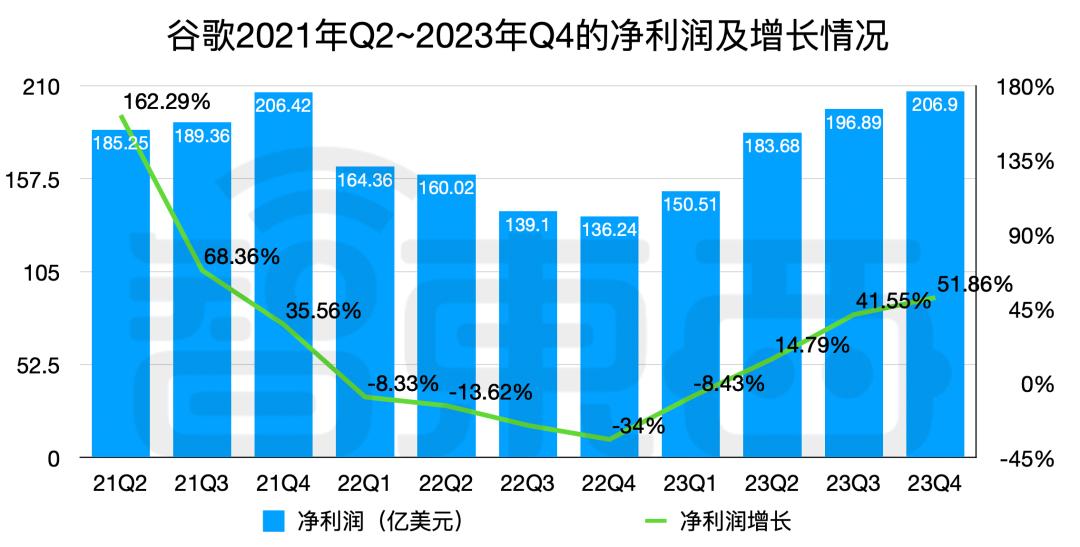 谷歌这边,谷歌母公司Alphabet在2023年Q4净利润为206.90亿美元,同比增长51.86%,更是重回高速增长。