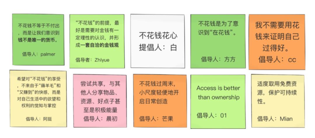 通过回收近100条的“不花钱过周末”的行动点子,小组从中提炼了3个关键原则:消费反思、物品共享、主动创造。