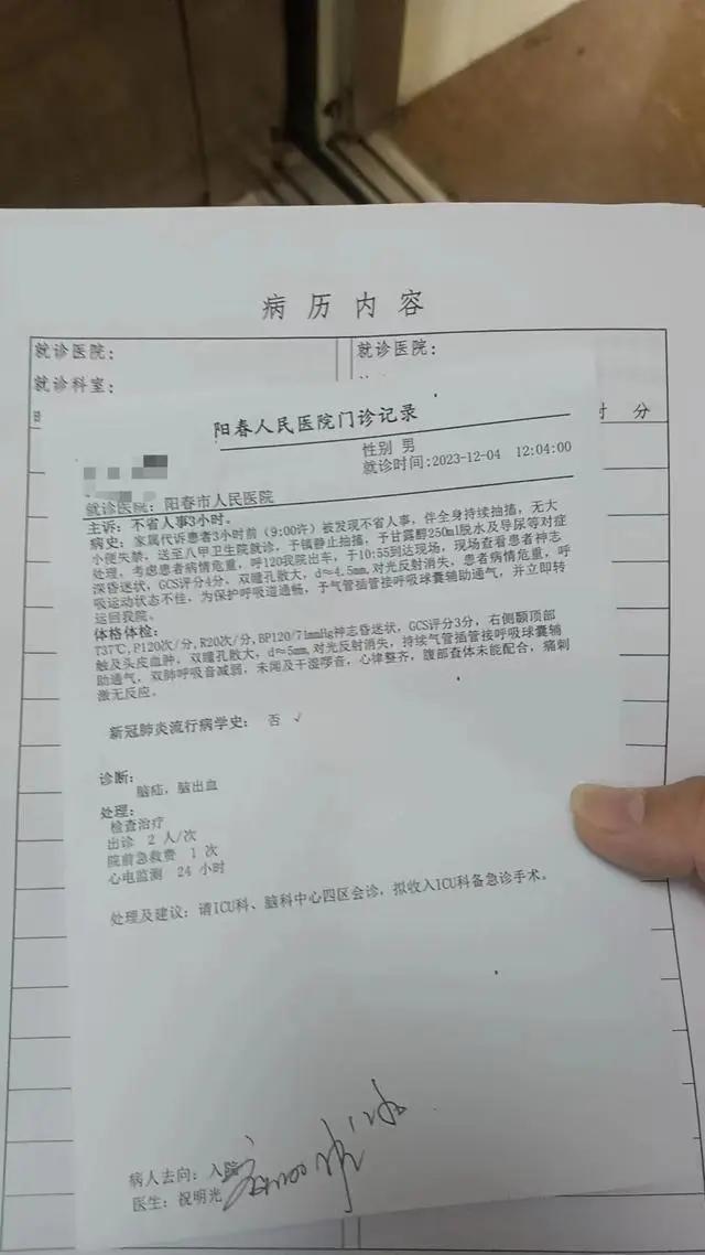 去年12月6日,有网友爆料,广东阳江阳春市八甲中学一名学生被三名学生殴打成了“植物人”。网友发布的几张阳春市人民医院的门诊记录、病例等显示,廖某某今年13岁,有“深昏迷”症状。阳春市人民医院去年12月4日的一张门诊记录显示,廖某某被诊断为脑疝、脑出血,拟收入ICU科备急诊手术。