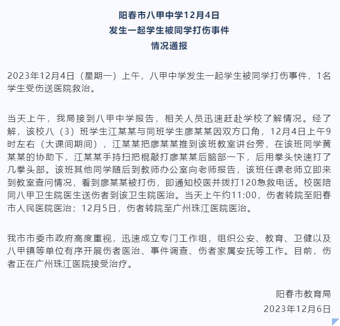 据“阳春融媒”微信公众号消息,2023年12月6日,阳春市教育局发布情况通报,2023年12月4日(星期一)上午,八甲中学发生一起学生被同学打伤事件,1名学生受伤送医院救治。经了解,该校八 (3) 班学生江某某与同班学生廖某某因双方口角,12月4日上午9时左右 (大课间期间),江某某把廖某某推到该班教室讲台旁,在该班同学黄某某的协助下,江某某手持扫把棍敲打廖某某后脑部一下,后用拳头快速打了几拳头部。该班其他同学随后到教师办公室向老师报告,该班任课老师立即来到教室查问情况,看到廖某某被打伤,即通知校医并拨打120急救电话。校医陪同八甲卫生院医生送伤者到该卫生院医治。当天上午约11:00,伤者转院至阳春市人民医院医治;12月5日,伤者转院至广州珠江医院医治。