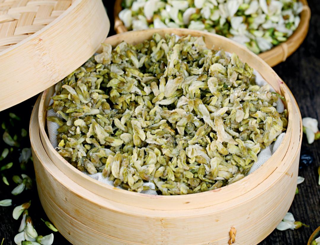 槐花麦饭据说也有100多年的历史了,做法特别简单,将含苞欲放的槐花洗净,掺入适量面粉后放入蒸锅,水开后转小火蒸20分钟左右,出锅;接下来将韭菜、大蒜切碎,放入盐、陕西的辣椒粉,泼入热油,拌匀,然后把此料汁拌入蒸好的麦饭中,即成。这个可能很多人吃不惯,却也是很多人心心念念的美食。