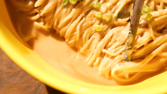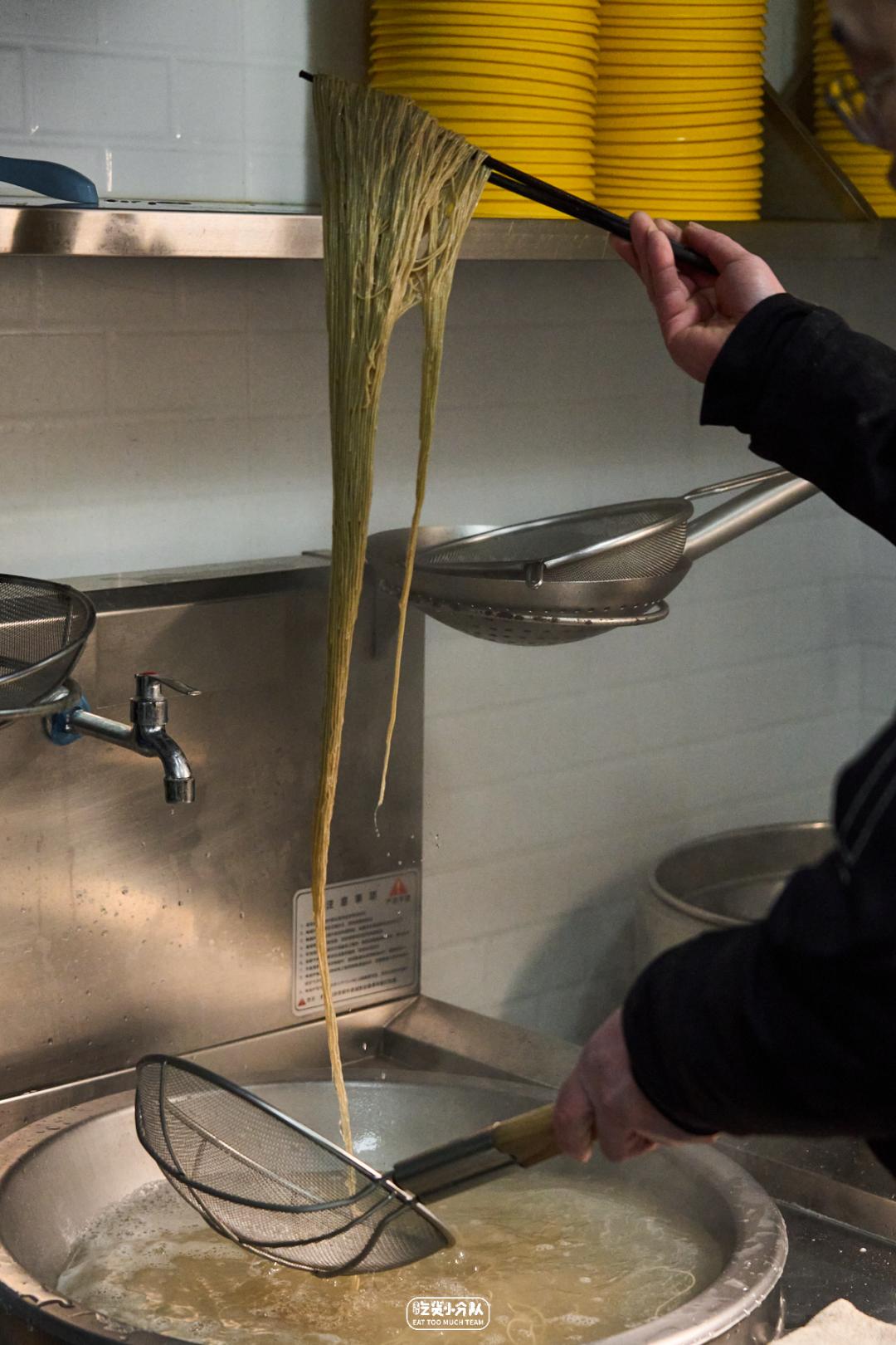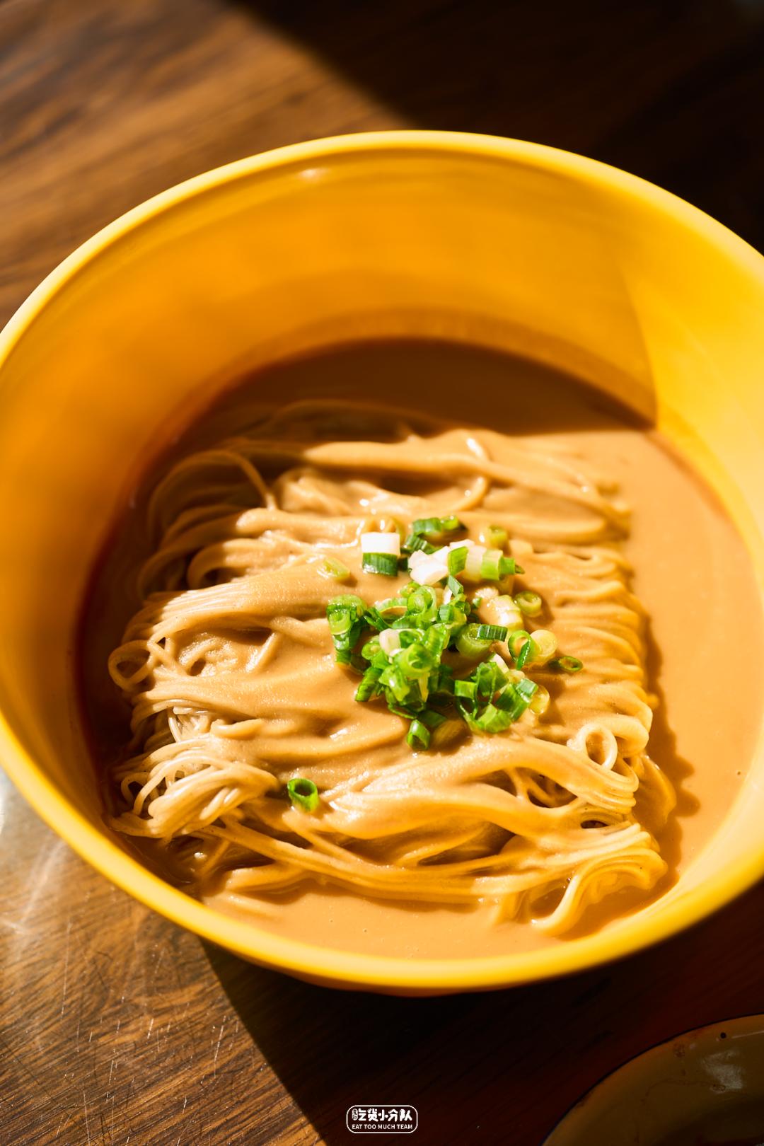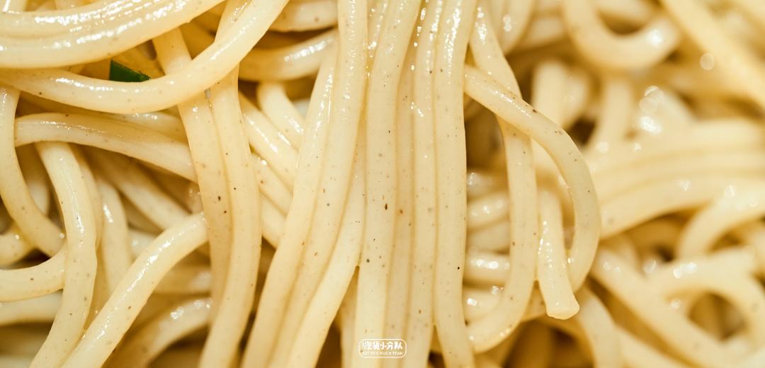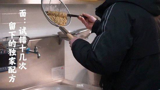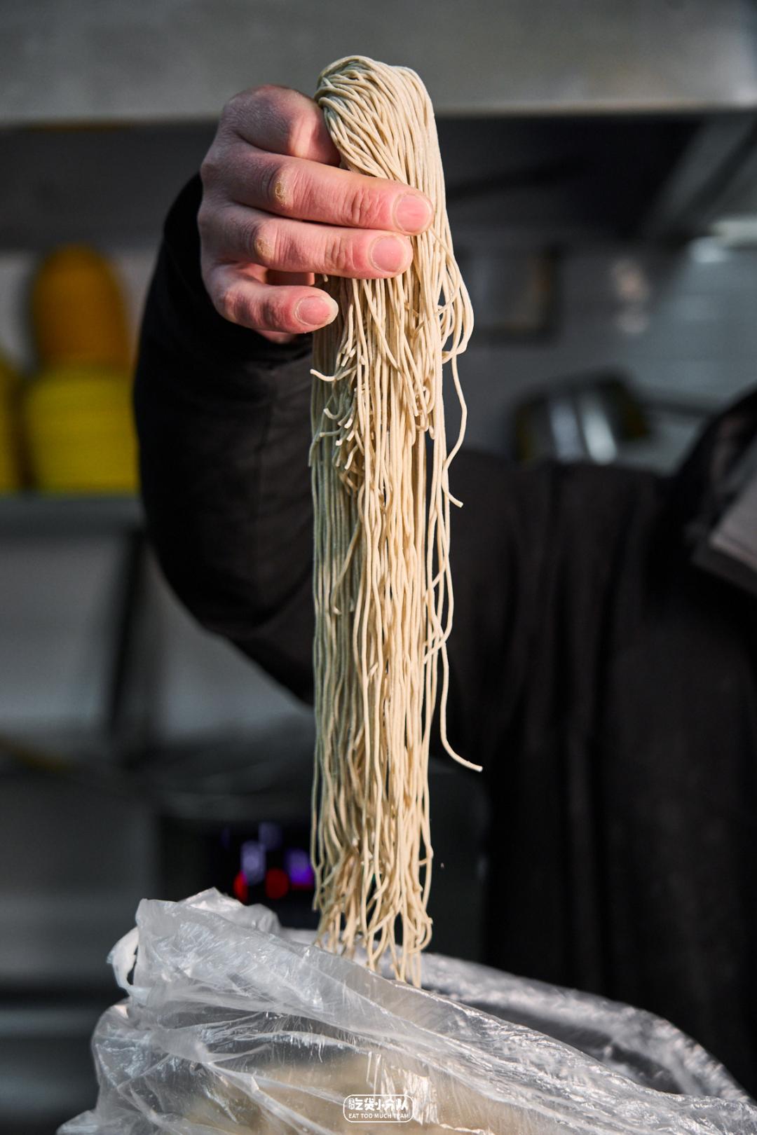 和那种单纯从面商拿货的面馆不同,他家面条配方,是邵主厨在开店之初,反复试错十几种配方后才敲定的。自己进的内蒙河套全麦粉和白面粉,送给面商按比例加工。煮的时候用筷子挑下水,扑腾不了多久再滤干水分就能出锅。< ➋ >
