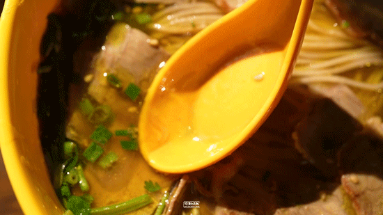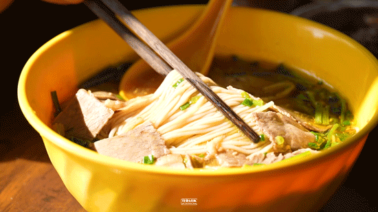 每天天还没亮,煮汤的火就得先烧起来。用大骨、蔬菜、香料等多种食材熬3-4小时,汤体清清亮亮,透着微微的暗黄色,站在厨房外就能闻到浓浓肉香。< ➌ >